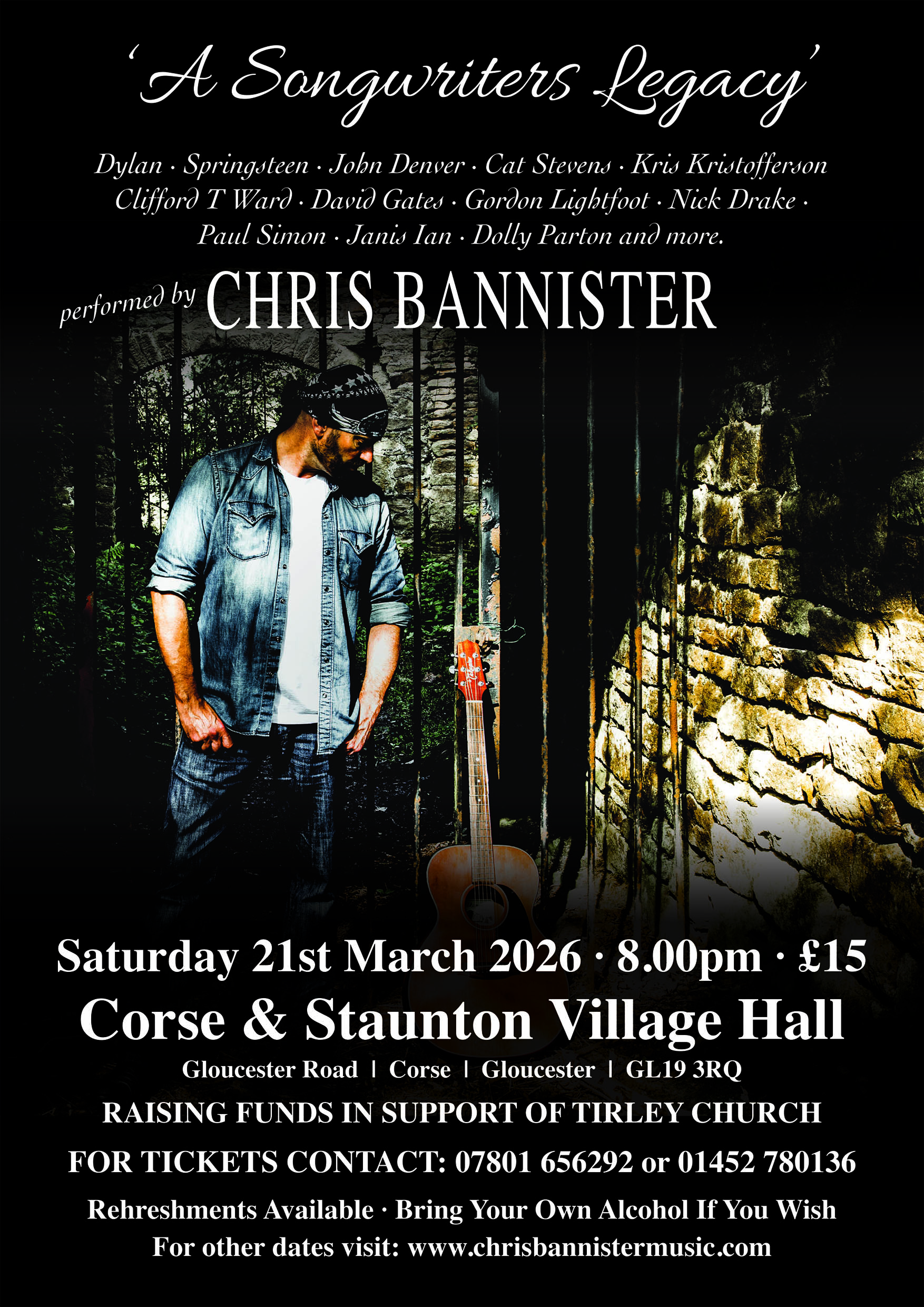 A pop concert, featuring Chris Bannister, will take place in Stauinton & Corse Village Hall on Saturday 21st March, with proceeds to raise funds for Tirley Church. See the poster for the event here.